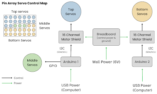 - Distributed Control: The team implemented an electronic architecture with two Arduino boards managing 35 servo motors (one per pin) to handle the high PWM channel load. Each pin was actuated individually to render an image to ensure the servo motors did not surpass the Arduinos’ current limits.