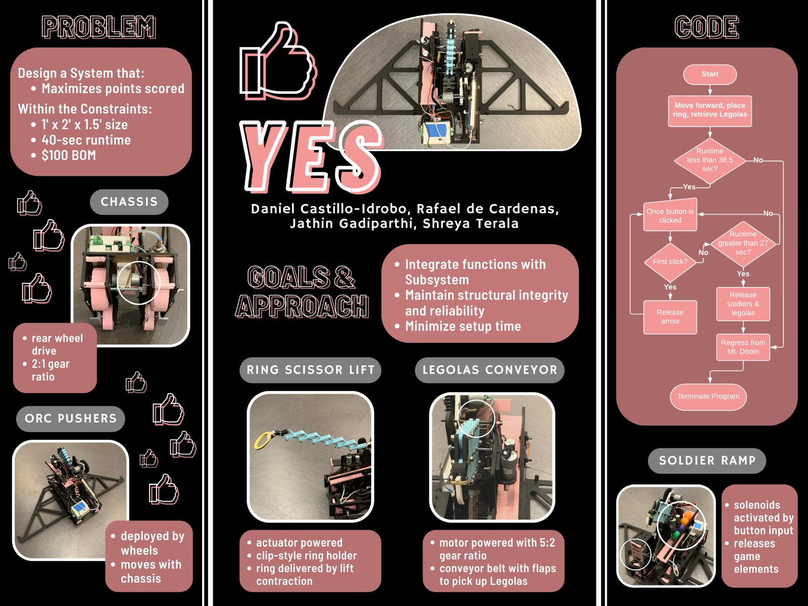 For the ME 2110 "Lord of the Rings" design challenge, we were tasked with building an autonomous robot to complete a complex set of tasks within 40 seconds. The machine had to fit within a 12"x24"x18" volume, strictly adhere to a $100 budget, and integrate multiple electromechanical subsystems to score points.